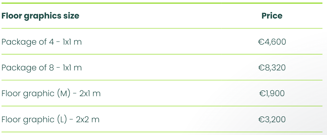 Draw visitors' attention and seamlessly drive traffic through the showfloor to your stand with eye-catching graphics placed in strategic locations: