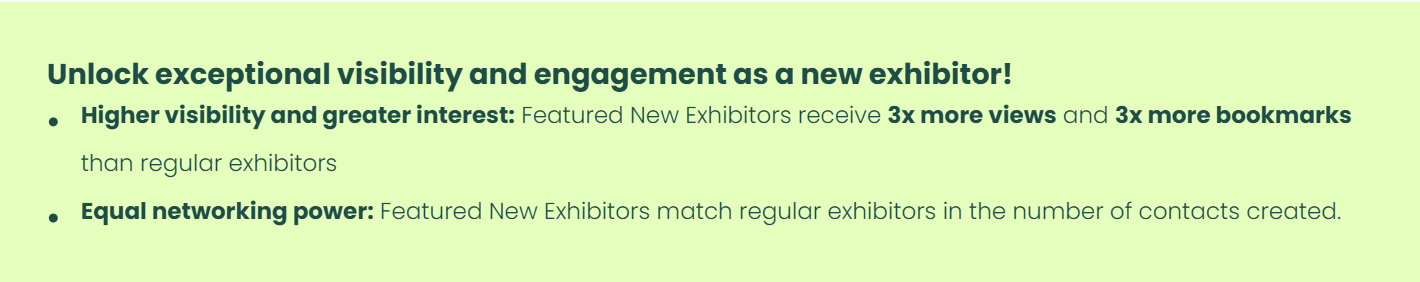 - Exhibitor List Highlight: Your company profile highlighted as a Featured New Exhibitor in the event platform, ensuring it is one of the first attendees see when browsing exhibitors.